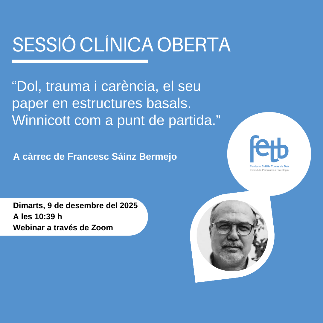 La sesión clínica abierta de diciembre, presentada por el psicoanalista y psicoterapeuta Francesc Sáinz Bermejo, girará en torno al concepto de estructura basal, que él mismo ha introducido, entendida como los cimientos a partir de los cuales se edifican los diferentes estados del self. El ponente destacará el papel que desempeñan la biología y la epigenética en contacto con las experiencias relacionales y los vínculos afectivos, que interactúan con otros factores ambientales y socioculturales.